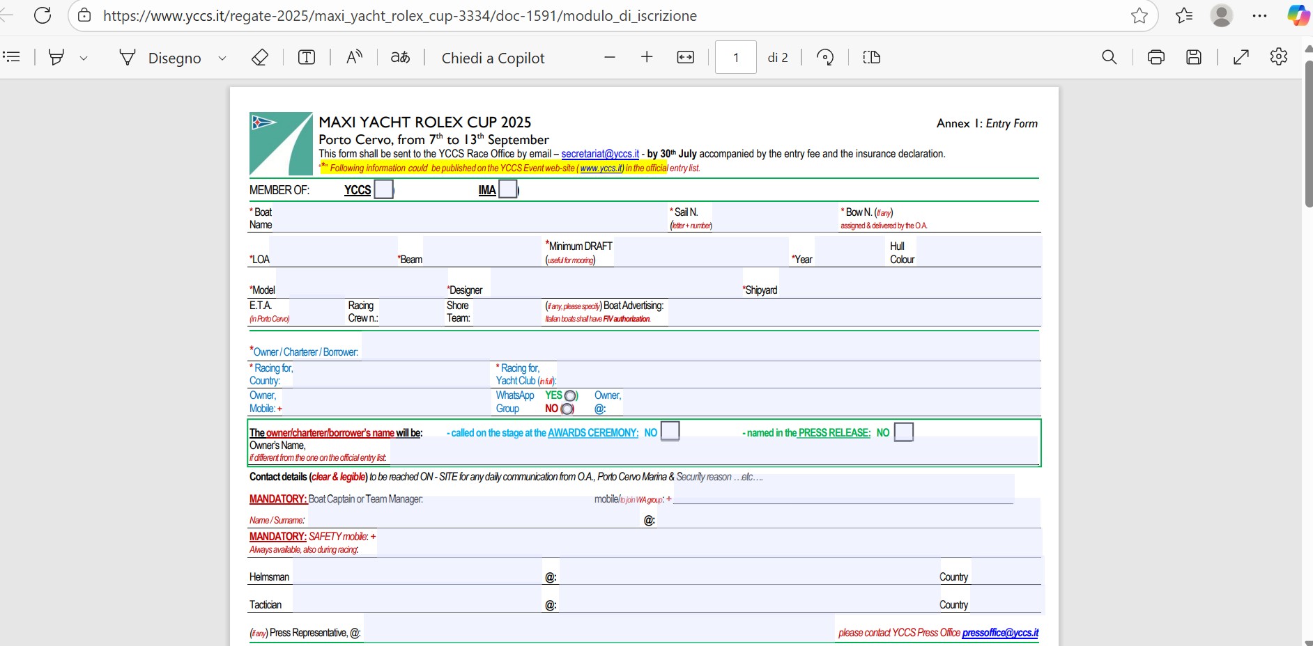 All the documents are provided in digital format as for example the Maxi Yacht Rolex Cup entry form.
