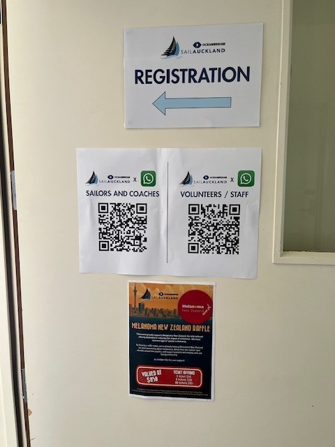 Reusable signage with QR codes helped sailors and volunteers easily join event WhatsApp groups, reducing printing and streamlining communication.